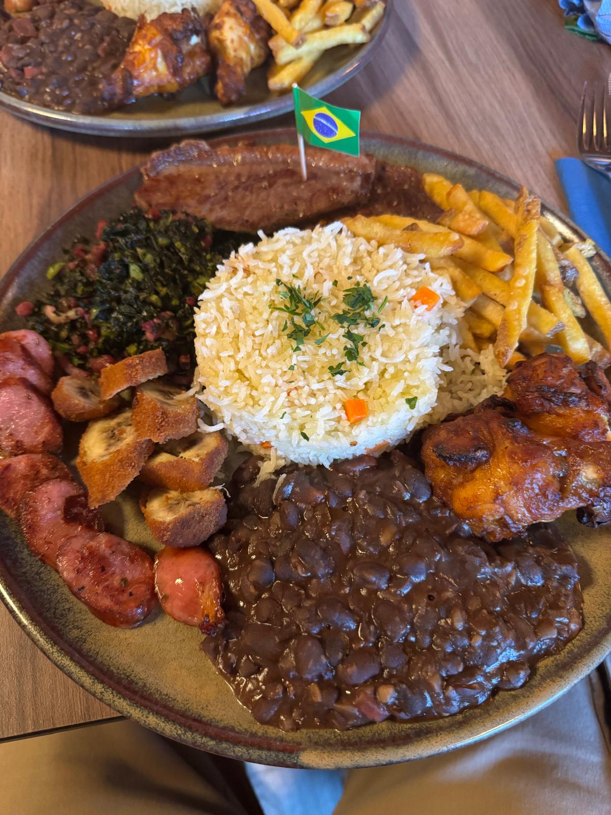 Pain Toasté, Viande Picanha Argentine, Haricots Noir, Banane Pané, Salade, Tomate, Bacon, Oignons Rouge, Ananas, Sauce Cocktail